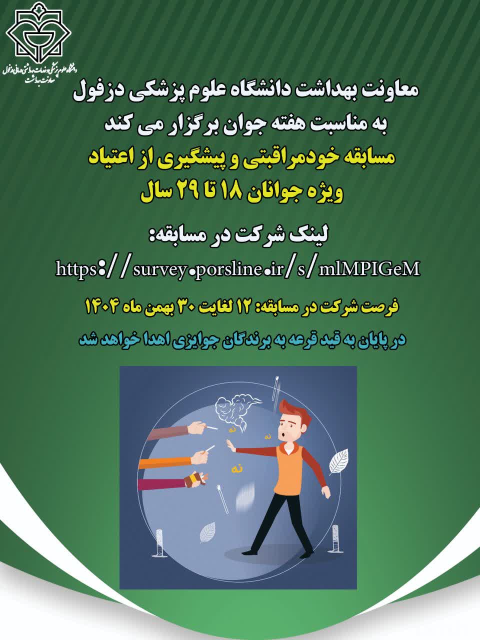 معاونت بهداشت دانشگاه علوم پزشکی دزفول، به مناسبت هفته جوان، مسابقهای بصورت پرسشنامه آنلاین، ویژه جوانان ۱۸ تا ۲۹ سال، برگزار مینماید.