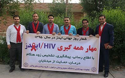 ظهر امروز به مناسبت بزرگداشت روز جهانی و هفته اطلاع رسانی ایدز مراسمی با حضور دکتر پریدار ریاست دانشگاه علوم پزشکی دزفول،دکتر توکلی معاون بهداشتی،مهندس اعلمی معاون فنی معاونت بهداشت،دکتر کلانتریان معاون درمان،خانم بساک سرپرست مدیریت توسعه پزوهشی و کلیه پرسنل معاونت بهداشتی در محل معاونت بهداشتی برگزار گردید.هدف از برگزاری این مراسم مهار همه گیری HIV/ایدز با اطلاع رسانی، پیشگیری ، تشخیص زودهنگام، درمان و حمایت از مبتلایان میباشد.