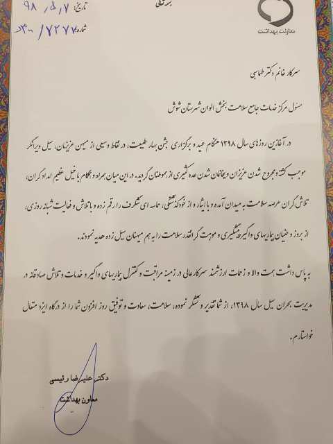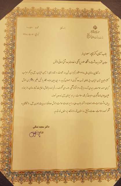 تقدیر و تشکر از دکتر مسعودی فر معاون بهداشت دانشگاه علوم پزشکی دزفول به پاس داشت همت والا و زحمات ارزشمند ایشان در مدیریت بحران سیل 98