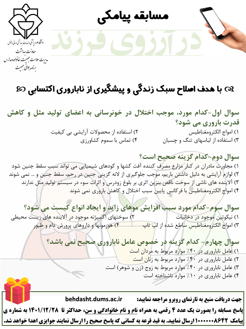 با سلام. این معاونت در نظر دارد با هدف اصلاح سبک زندگی و پیشگیری از ناباروری اکتسابی مسابقه پیامکی با عنوان «در آرزوی فرزند» برگزار می نماید.